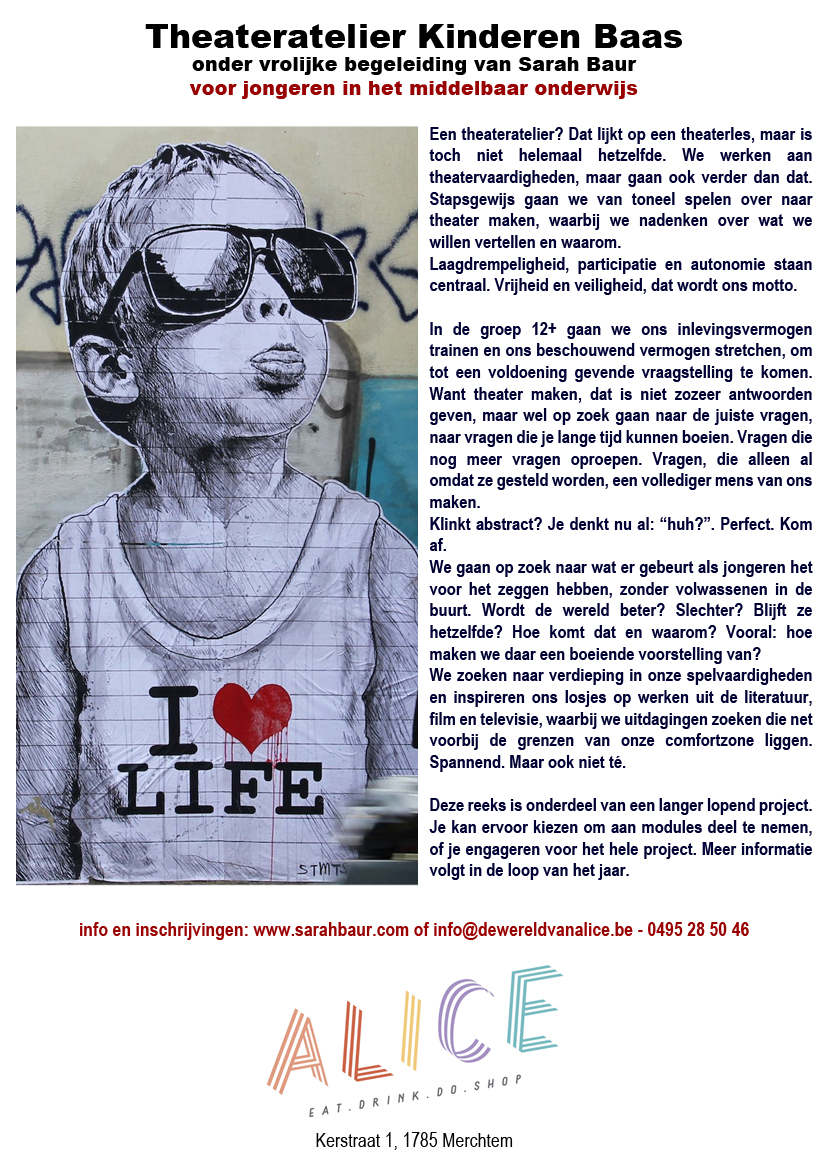Op 16 september gaat een nieuwe reeks theaterateliers van start bij De Wereld van Alice in Merchtem. Onder het thema ‘Kinderen Baas‘ mogen kinderen vanaf 6 jaar en jongeren vanaf 12 jaar de theaterteugels zelf in handen nemen.